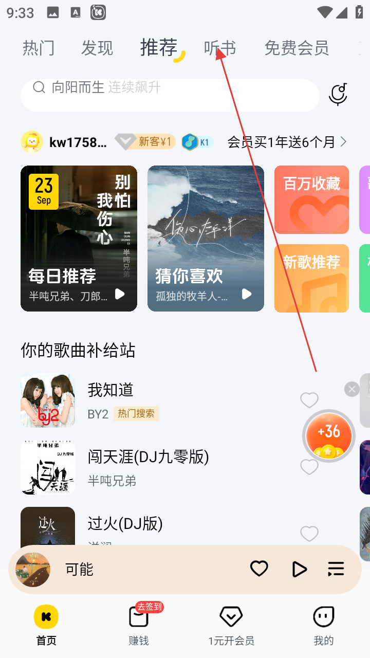 1、打开酷我音乐,在首页顶部点击【听书】选项,进入听书页面,可看到各类听书相关功能入口。