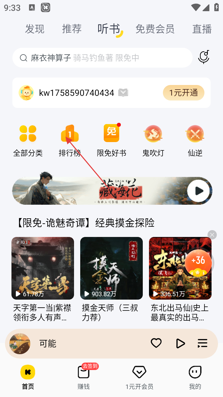 2、进入听书页面后,点击【排行榜】选项,进入听书排行榜页面,查看不同榜单的听书作品。