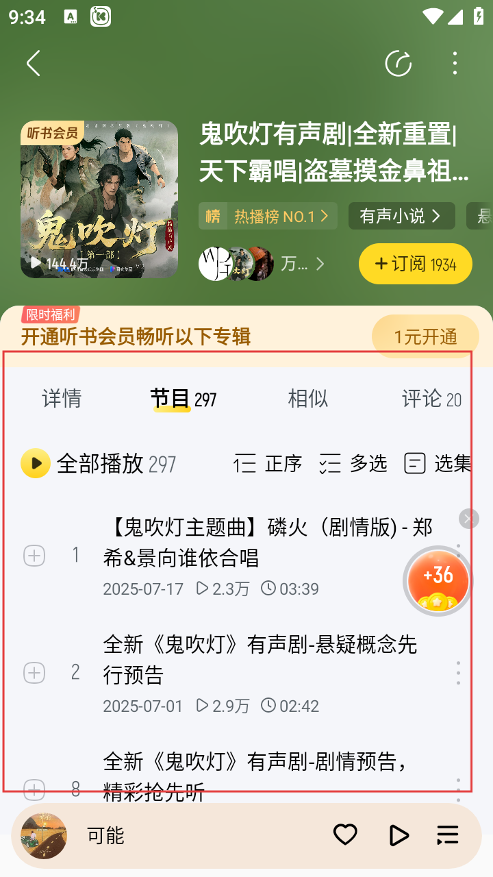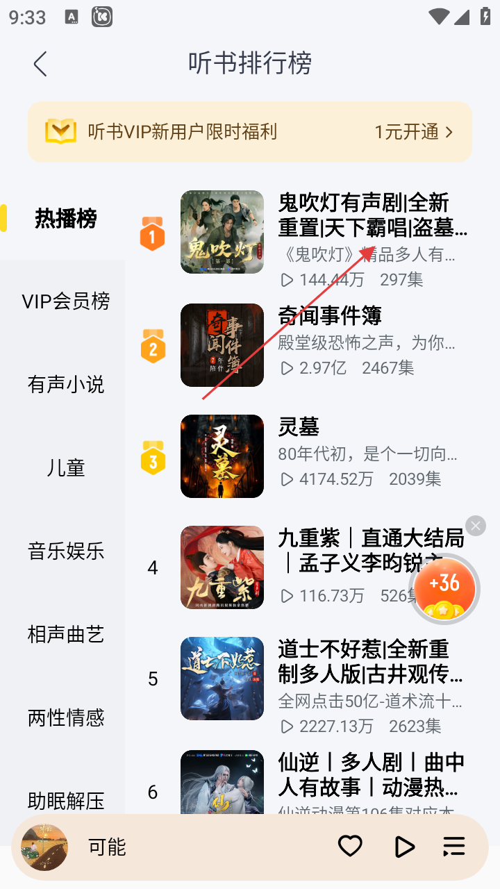 3、在听书排行榜页面,选择热播榜第一名的【鬼吹灯有声剧|全新重置|天下霸唱|】作品,点击进入其详情页。