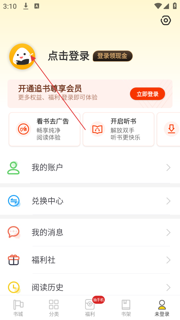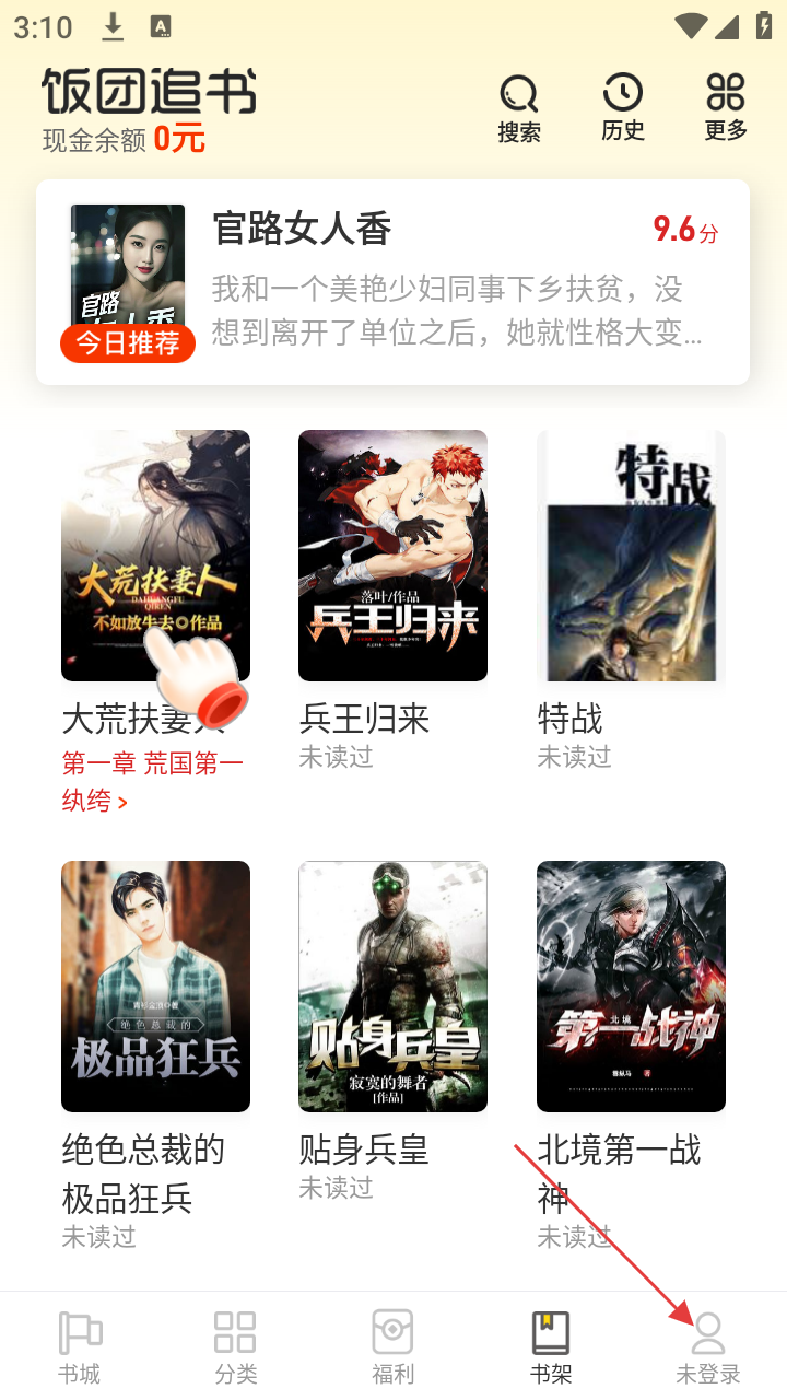 1、在饭团追书首页,点击底部【未登录】选项,可进入登录相关页面。