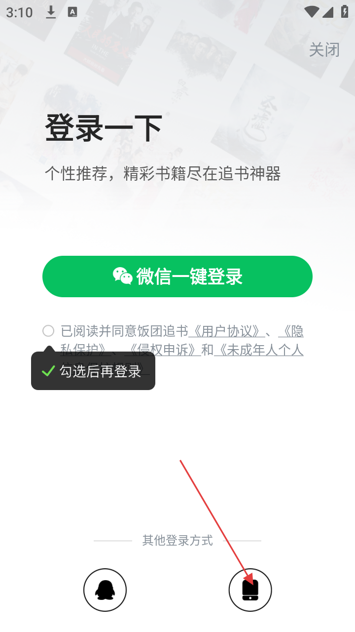 3、在登录选择页面,可选择【微信一键登录】或其他登录方式,如手机登录。若选择手机登录,点击对应图标。