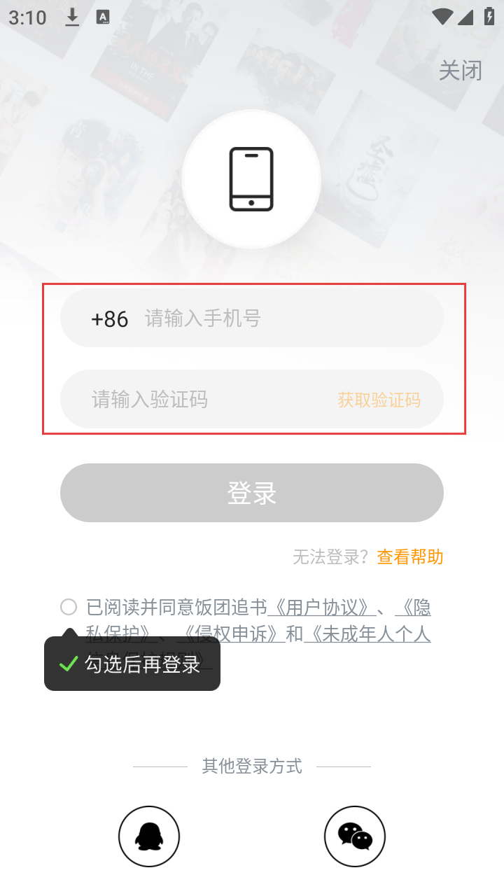 4、在手机登录页面,输入手机号,获取并输入验证码,勾选同意相关协议后,点击【登录】按钮即可完成登录操作。