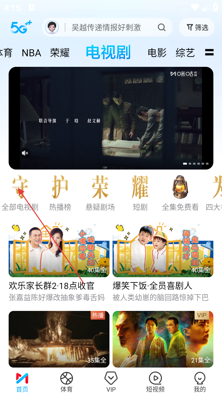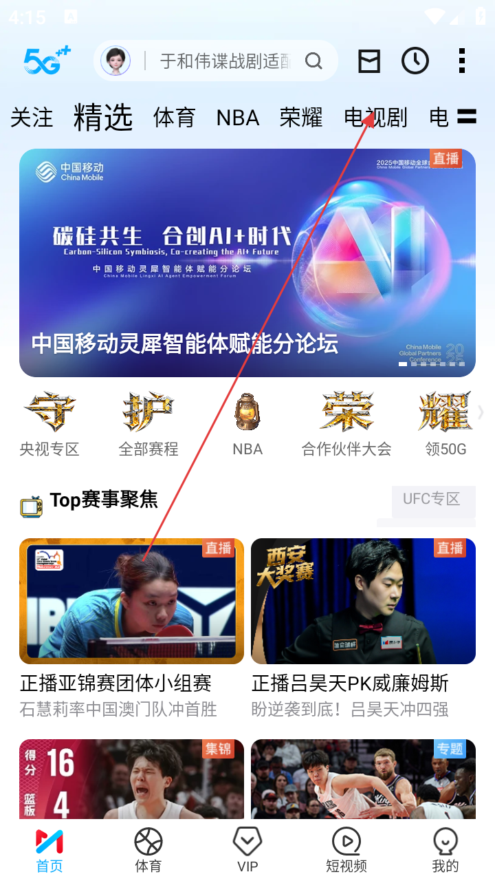 1、进入咪咕视频首页,有【关注】【精选】等分类,还有赛事直播推荐,点击【电视剧】可进入电视剧页面。