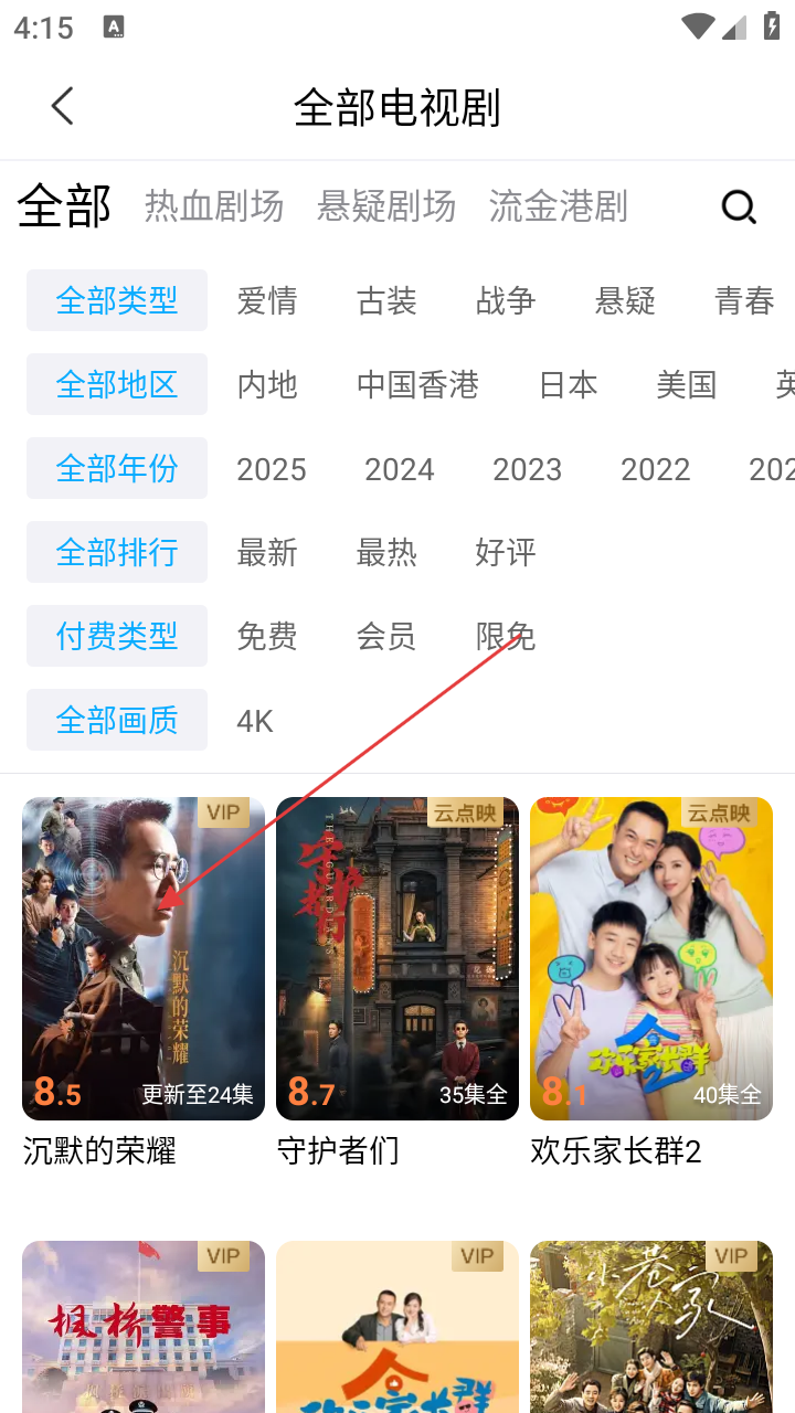 3、进入全部电视剧页面,可按类型、地区等筛选,找到《沉默的荣耀》后点击可进入该剧播放页。