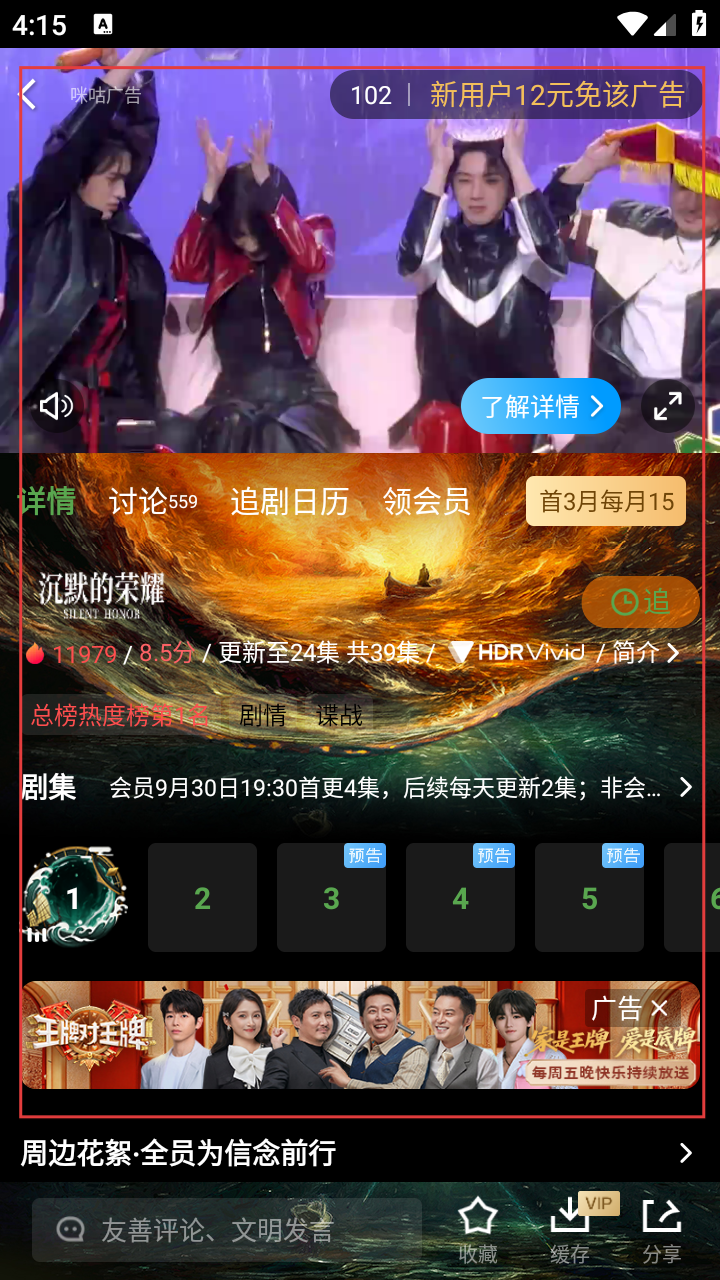 4、进入《沉默的荣耀》播放页,可查看剧集详情、追剧日历等,还能选择集数观看,新用户可12元免广告。