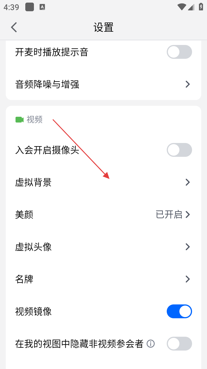 3、在设置界面,点击【虚拟背景】选项,进入虚拟背景设置页面,挑选合适背景。