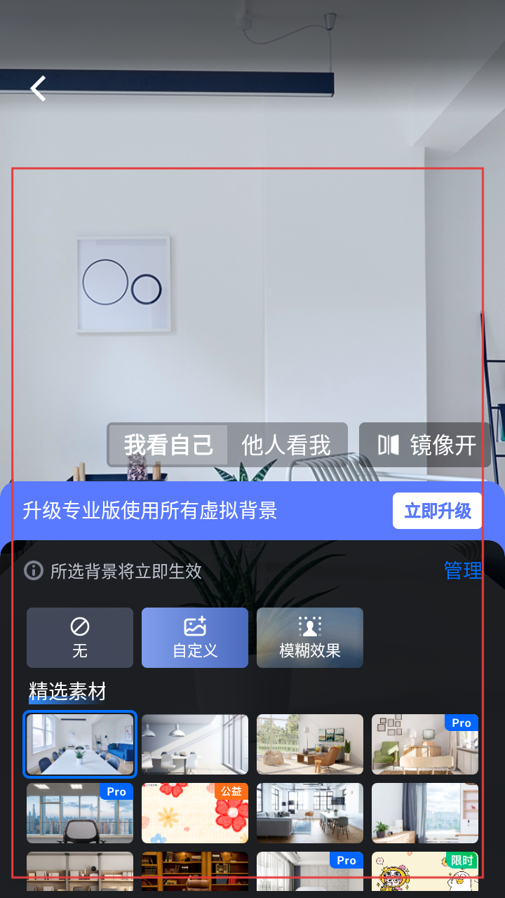 4、在虚拟背景设置页面,可选择【无】【自定义】【模糊效果】,也能从精选素材中选背景,所选背景立即生效。
