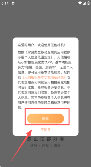 1、阅读隐私政策后点同意,即可立即使用拍摄、美颜、滤镜等基础功能。