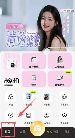 2、在首页进入会员专区,先试清透滤镜,再体验AI修图与高清录屏功能。