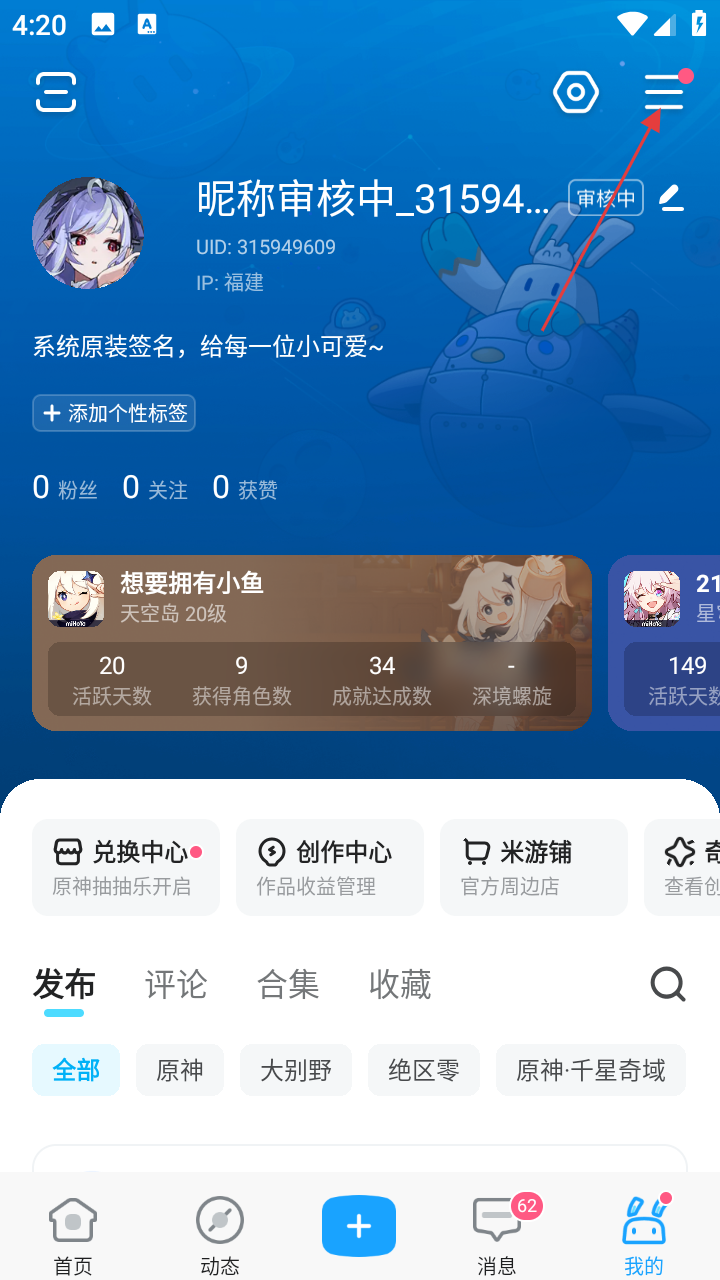 1、在米游社首页,点击右下角【我的】,可进入个人相关界面,界面展示有登录入口、兑换中心等功能。