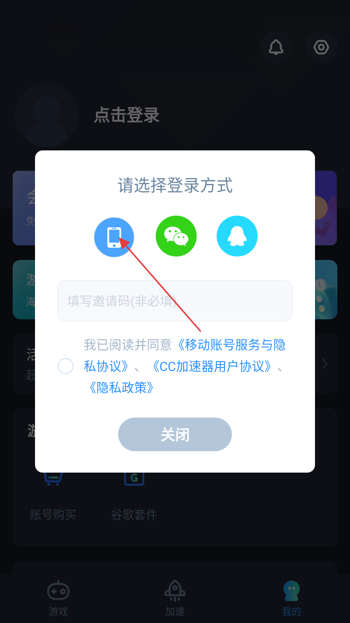 1、在CC加速器首页,点击底部【我的】选项,进入个人中心页面。