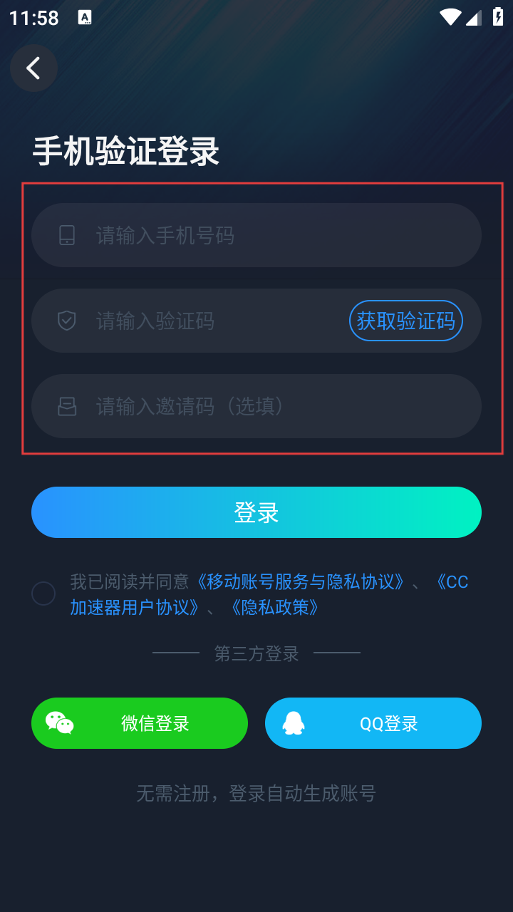 4、在手机验证登录页面,输入手机号码,点击【获取验证码】,点击【登录】按钮,即可完成登录操作。