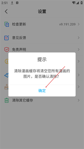 3、在设置界面,找到并点击【清除图片缓存】选项,弹出“提示”弹窗,说明“清除漫画缓存将清空所有漫画的图片”。