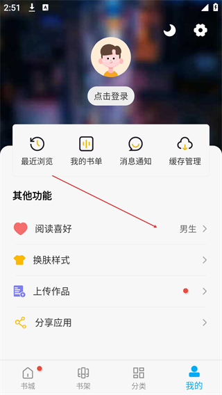 2、在个人中心,找到并点击【阅读喜好】选项,进入性别选择界面。