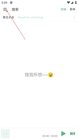 1、在音乐软件搜索页面,点击左上角菜单按钮,可展开功能列表,进行后续操作。