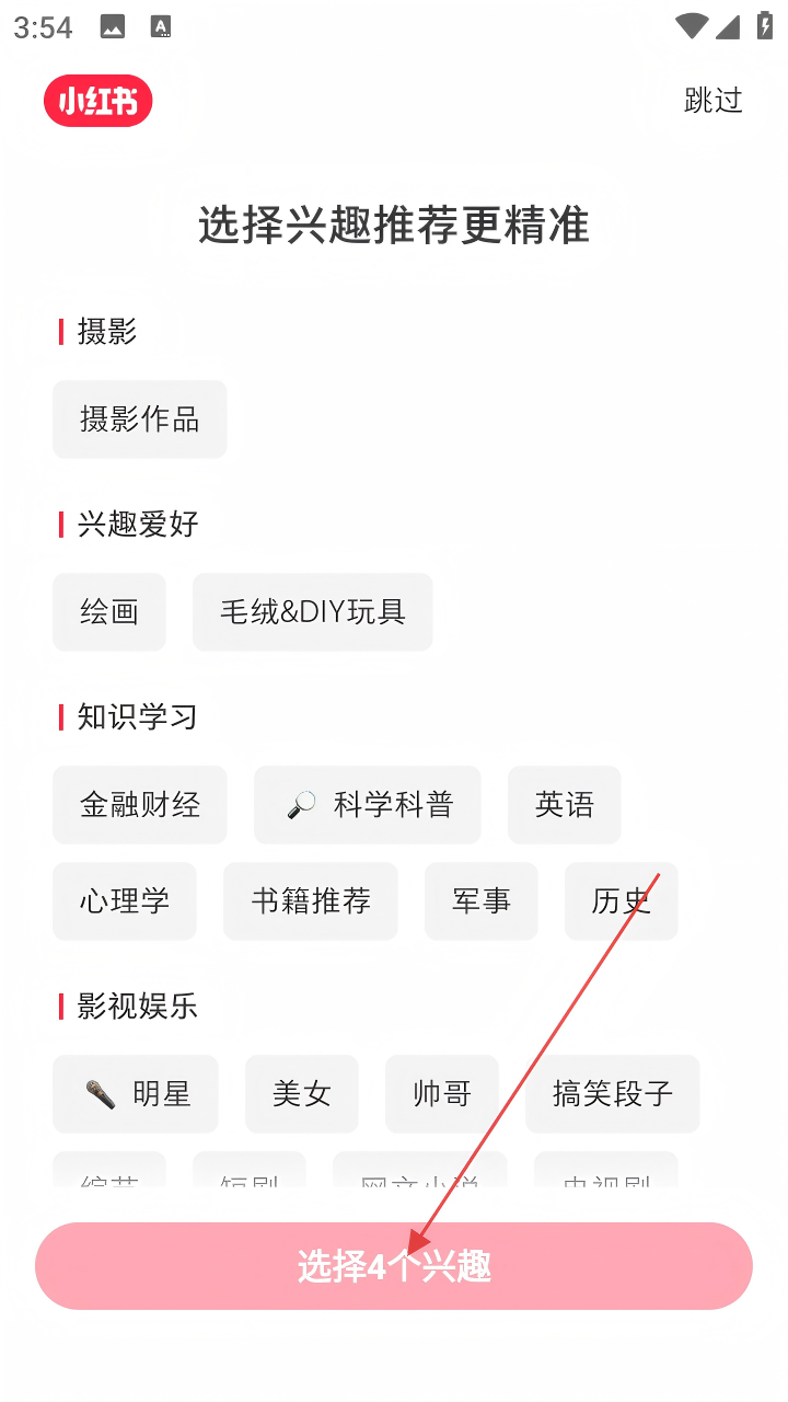 2、登录后进入兴趣选择页面,挑选4个兴趣,助力获取精准推荐。