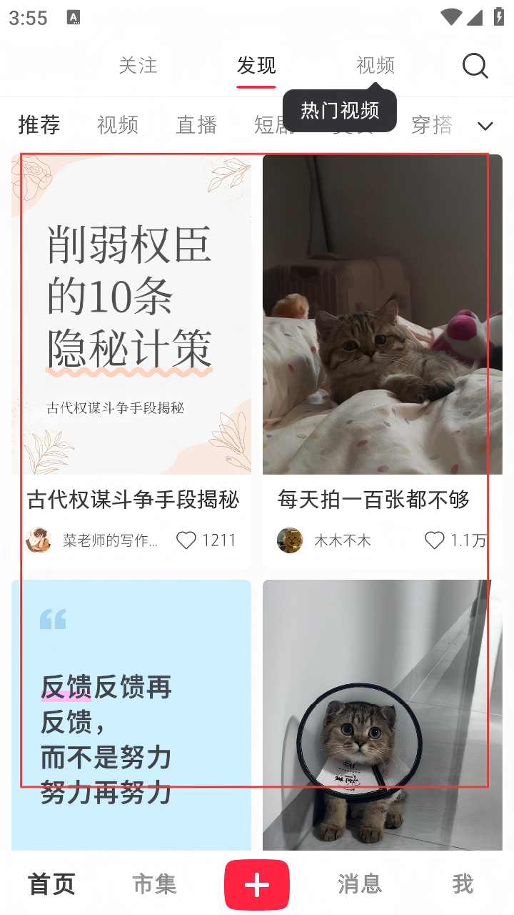 3、选好兴趣后,进入“发现”页面,浏览各类推荐内容。