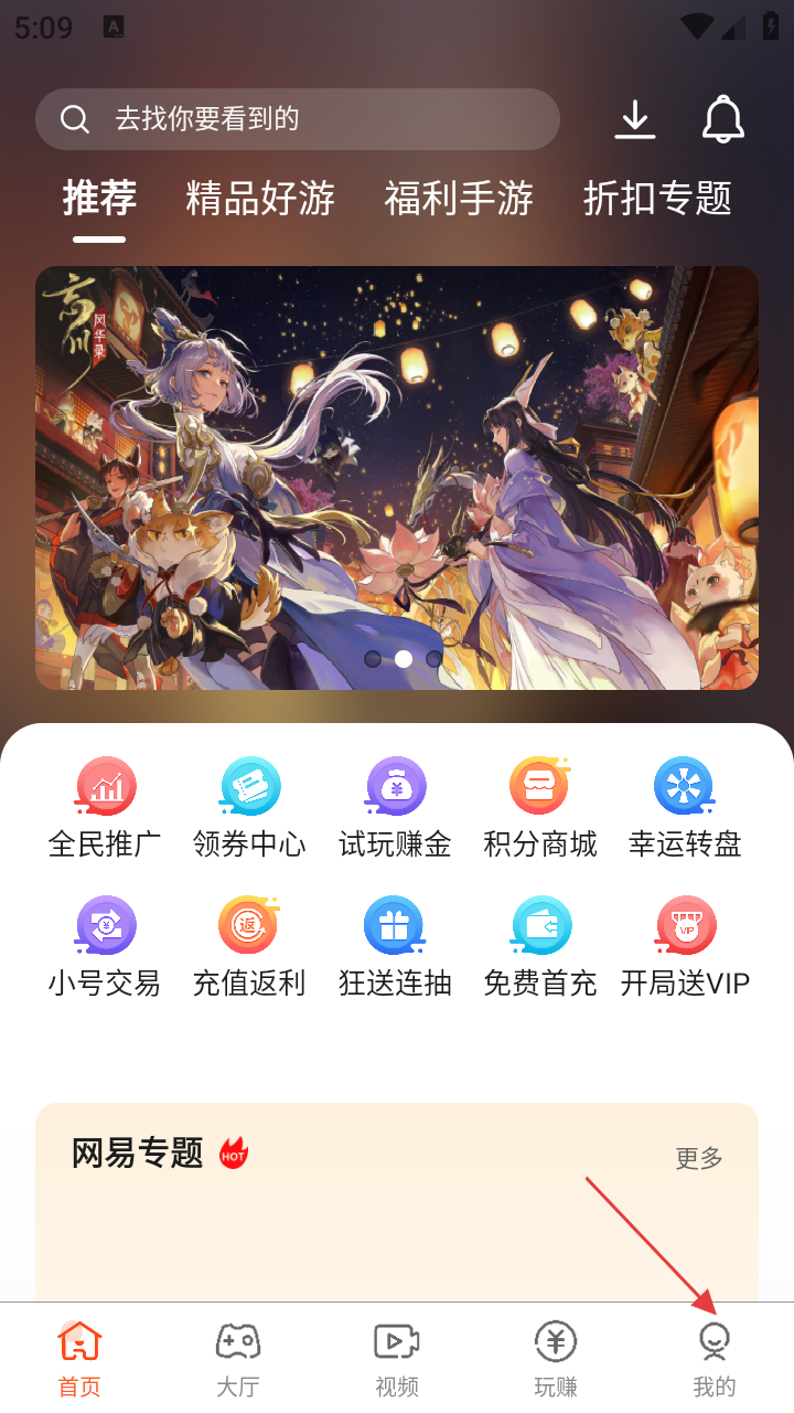 1、在游戏平台首页,点击右下角【我的】,可进入个人相关界面,界面展示有登录入口、常用功能等选项。
