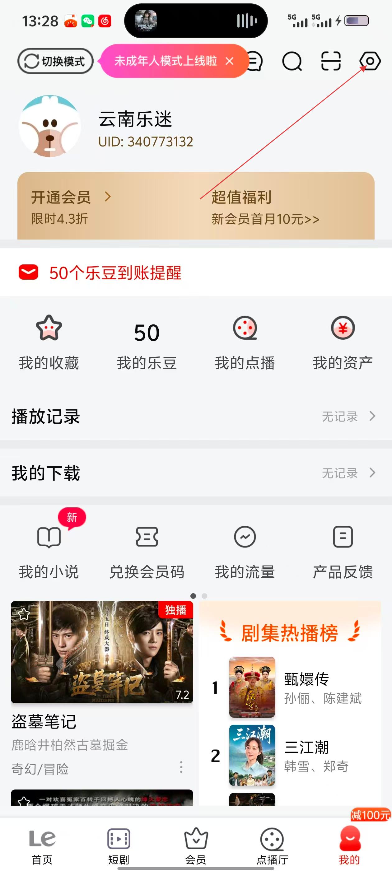 2、登录后进入“我的”页面,能看到【我的收藏】【我的乐豆】等功能,点击右上角设置图标可进入设置界面。