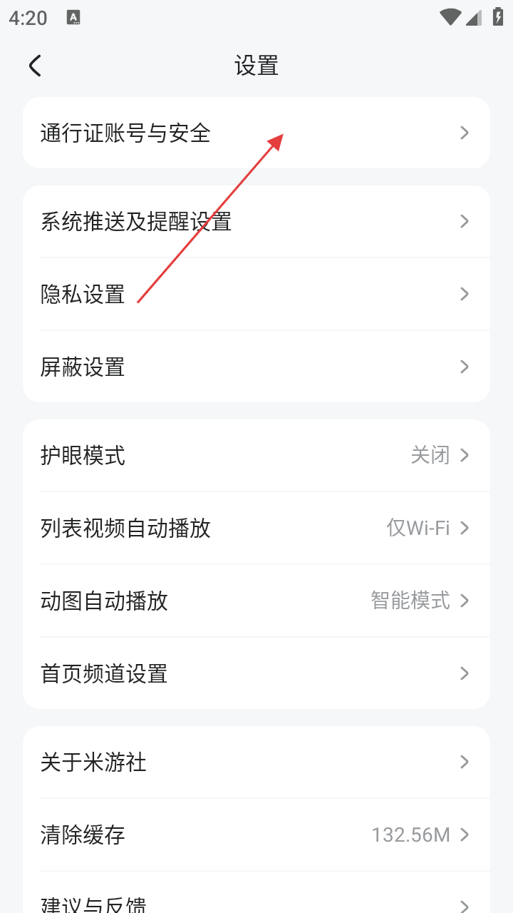 3、在设置页面,点击【通行证账号与安全】选项,可进入账号与安全界面,界面显示修改密码、手机号等功能。