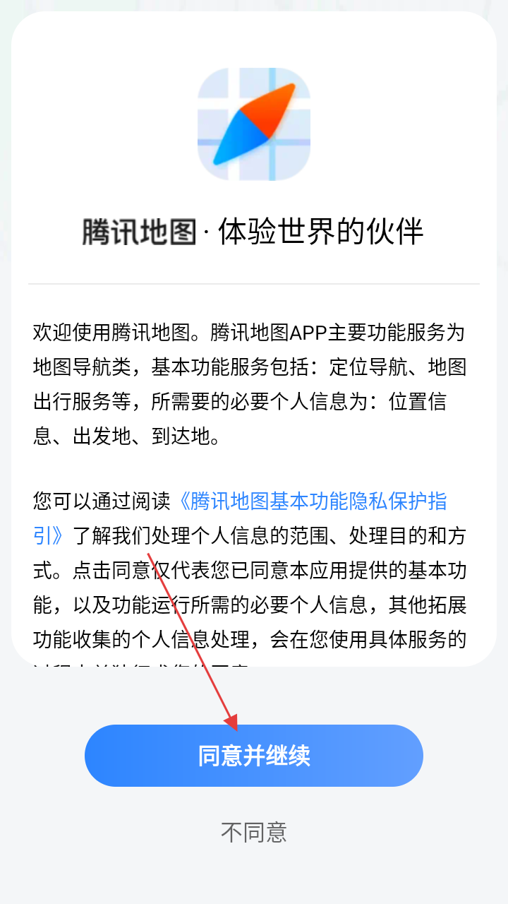 1、打开腾讯地图APP,看到隐私保护指引页面,点击【同意并继续】按钮,进入主界面。