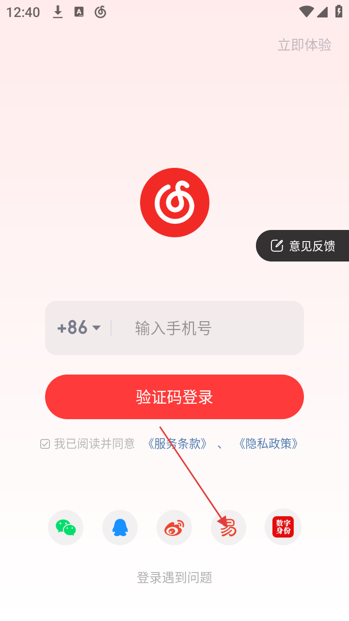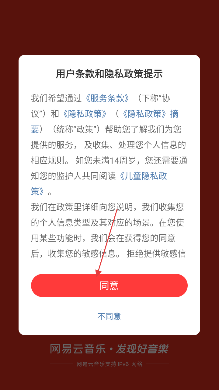 1、打开网易云音乐,会弹出用户条款和隐私政策提示框,仔细阅读后点击【同意】,即可进入登录界面。