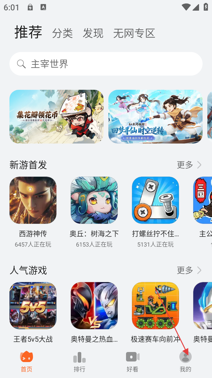 1、在游戏平台首页,可浏览推荐游戏、新游首发、人气游戏等内容,点击【我的】进入个人页面。
