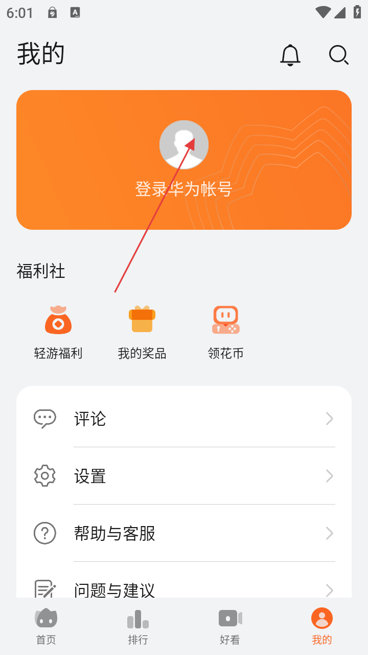 2、在【我的】页面,点击登录华为帐号可进入登录界面,还能查看福利社、评论、设置等功能。