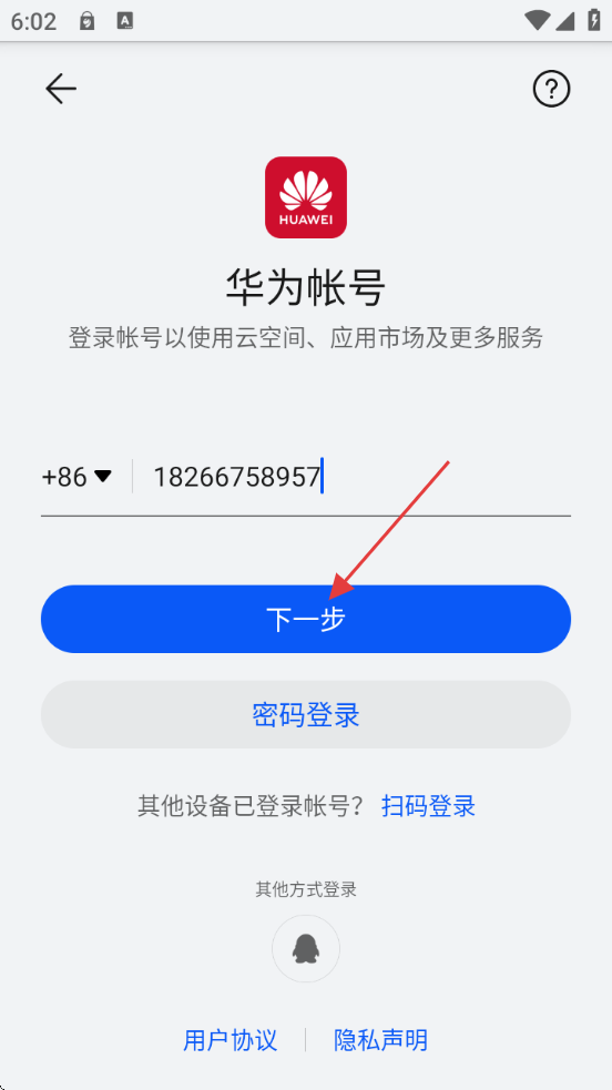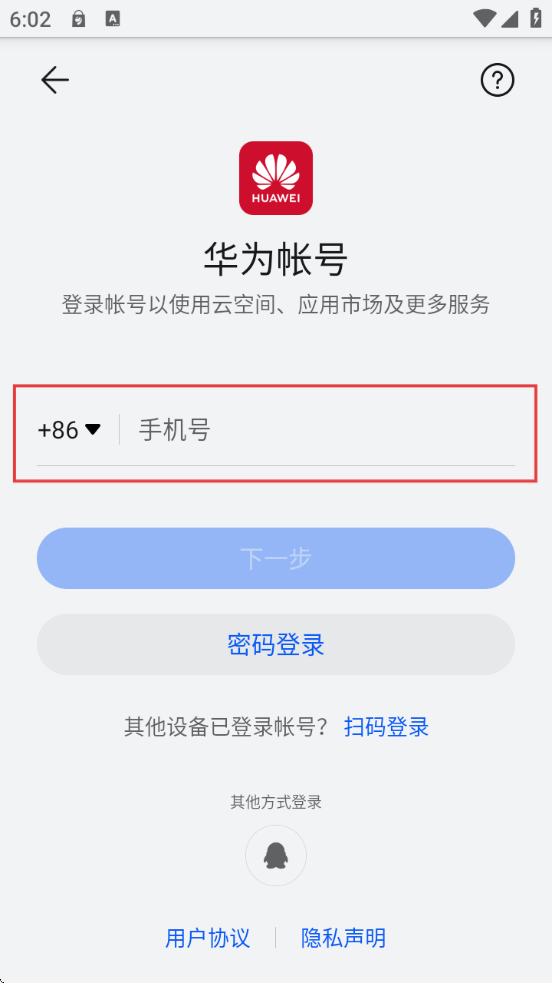 3、在华为帐号登录界面,输入手机号,可选择密码登录、扫码登录等方式进行登录。
