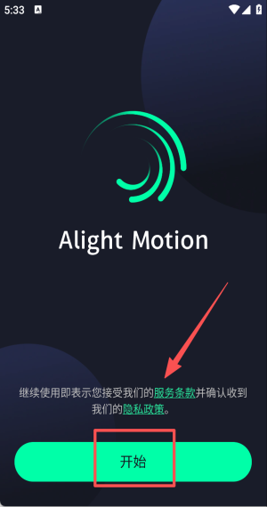 1、打开 Alight Motion,点击“开始”接受服务条款与隐私政策即可进入主界面。